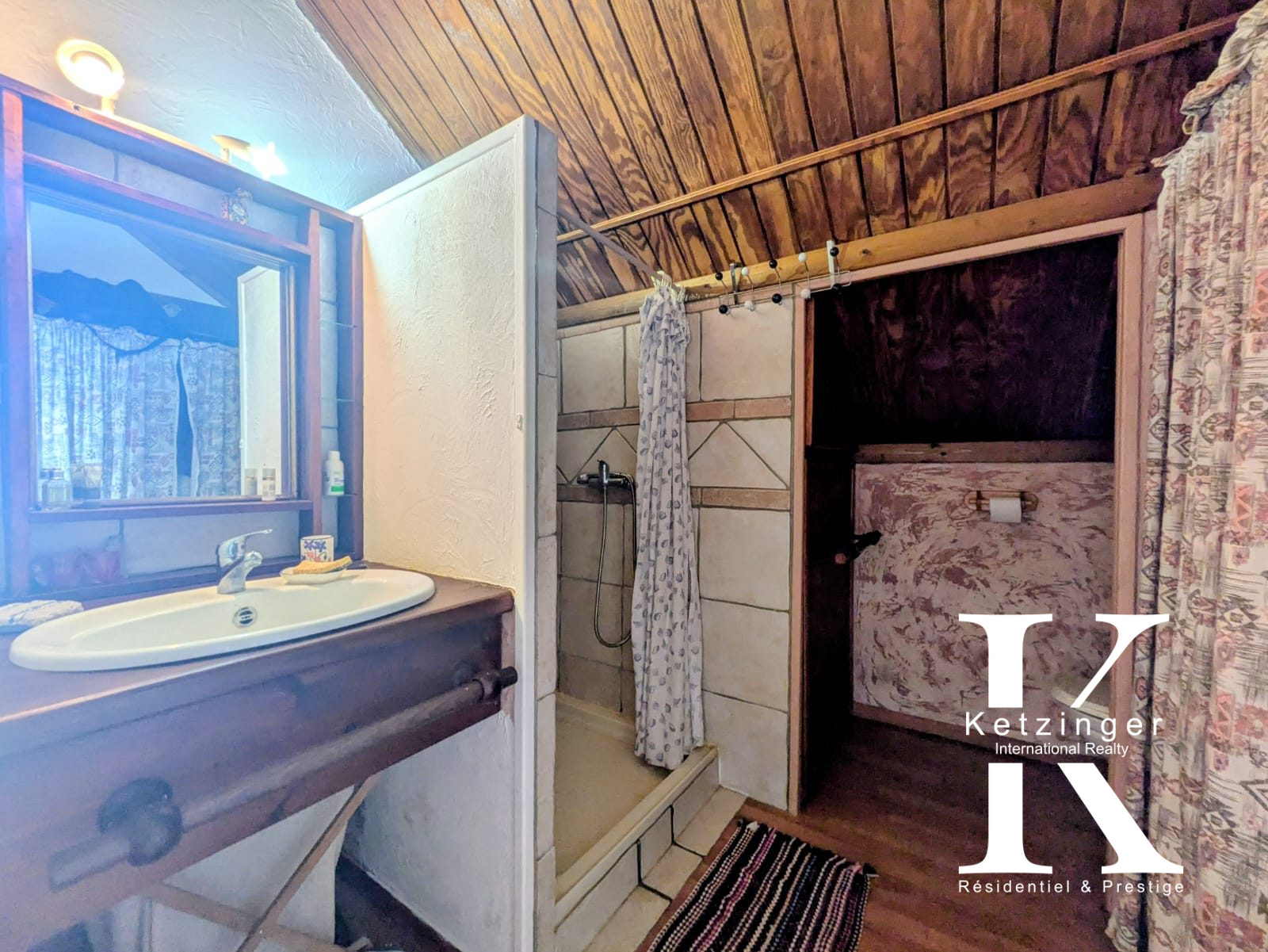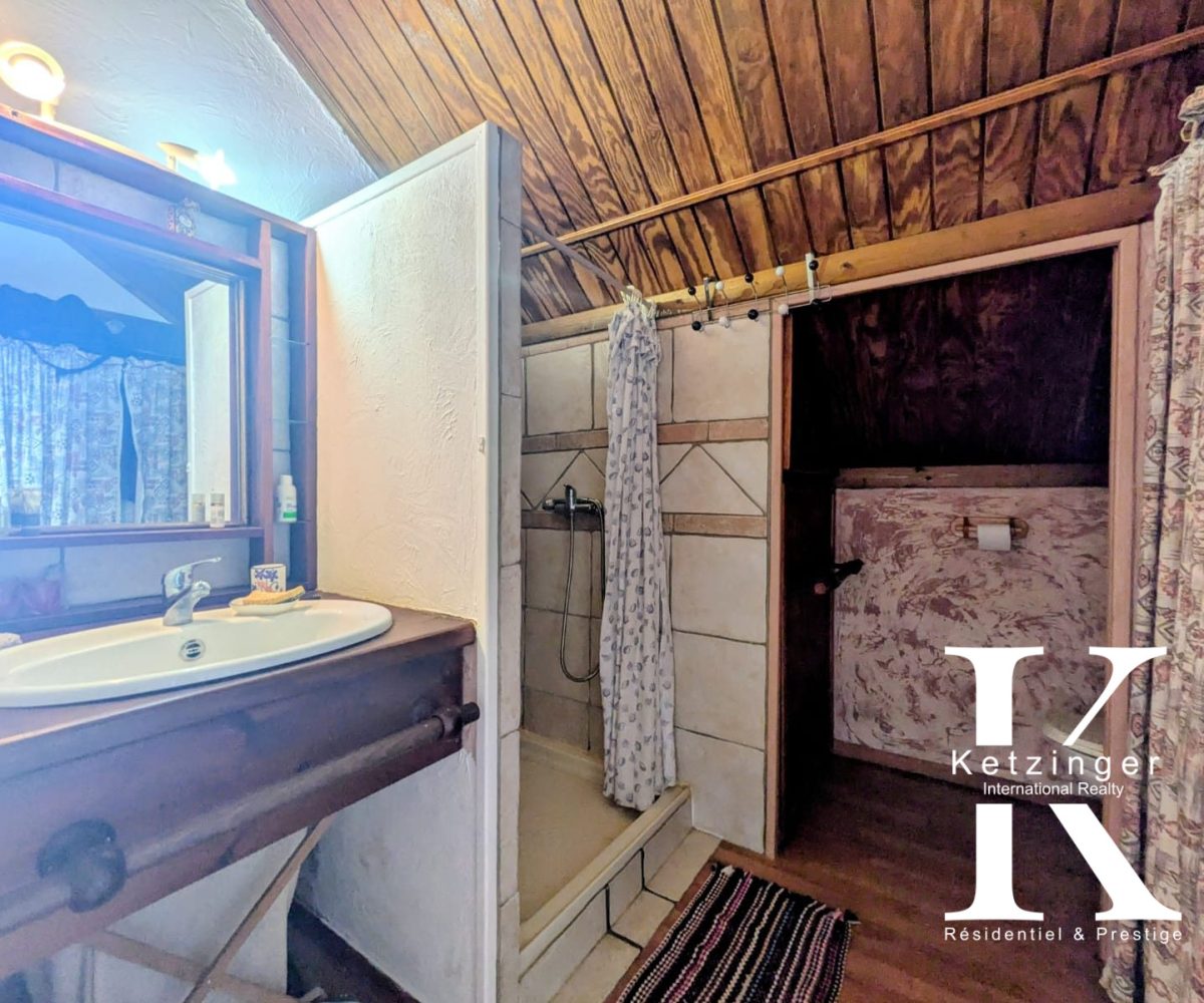 A l’étage, 1 chambre avec sa salle d’eau,1WC, 1 coin bureau,TV.